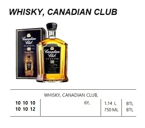 | Description | WHISKY, CANADIAN CLUB, 6Y, 1.14 L |