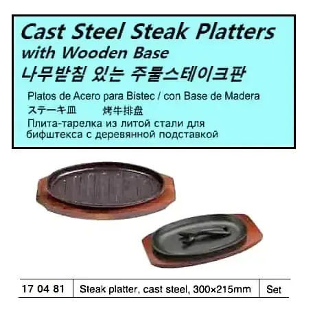 | Description | CAST STEEL STEAK PLATTER WITH WOODEN BASE, 300 x 215 MM |