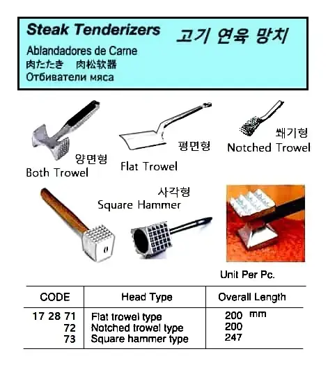 | Description | STEAK TENDERIZER, SQUARE HAMMER TYPE, 247 MM OVERALL |