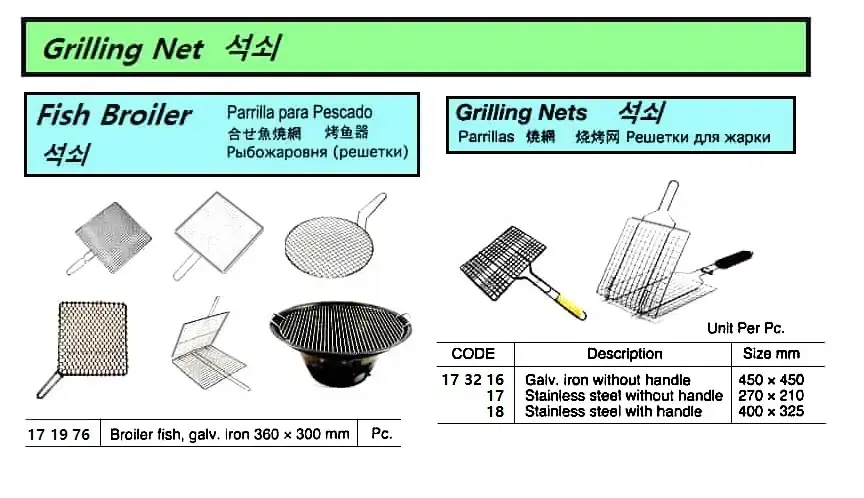 | Description | JAPANESS STYLE, GALV. IRON GRILLING NET WITHOUT HANDLE, 450 x 450 MM |