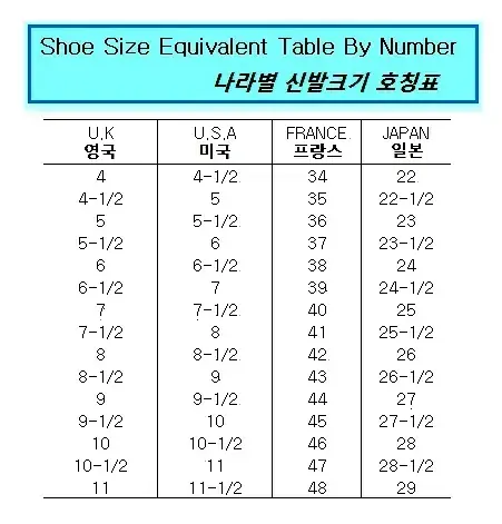 SHOE SIZES EQUIVALENT TABLE BY NUMBER