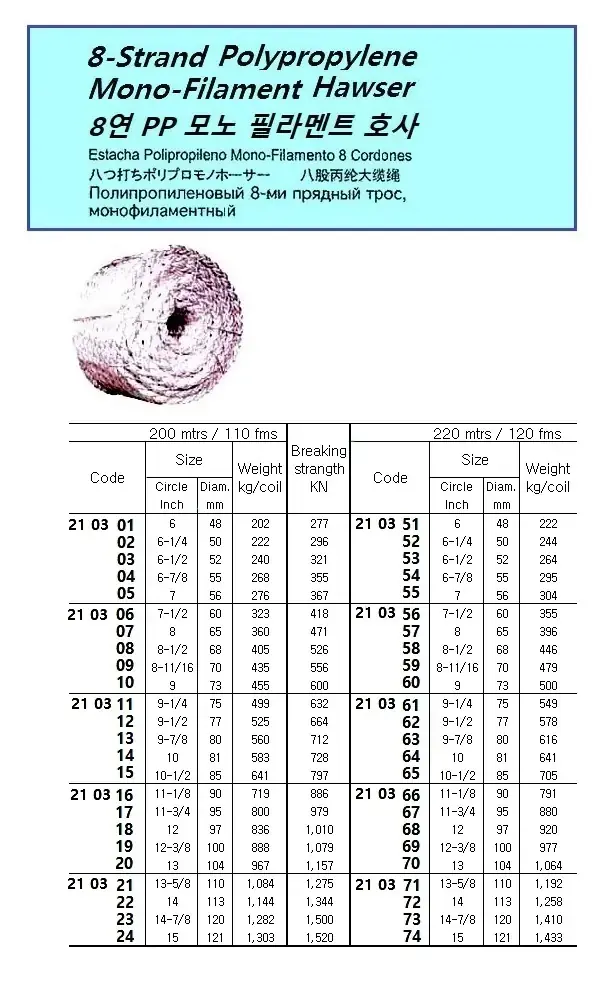 | Description | HAWSER P.P MONO-FILAMENT 8-STR. 12-3/8"CIR ( D= 100 MM )x 220 M |