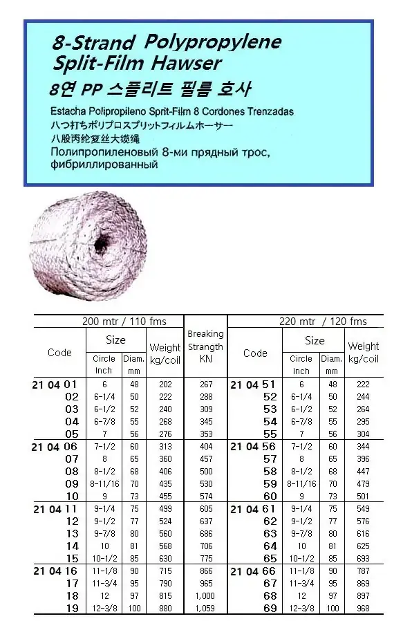 | Description | HAWSER P.P SPLIT-FILM 8-STR. 10-1/2"CIR ( D= 85 MM ) x 200 M |