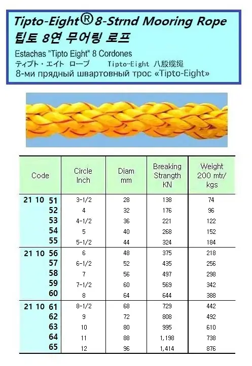 | Description | 8-STR TIPTO-EIGHT MOORING ROPE . 11"CIR x 200 M ( D= 90 MM ) |