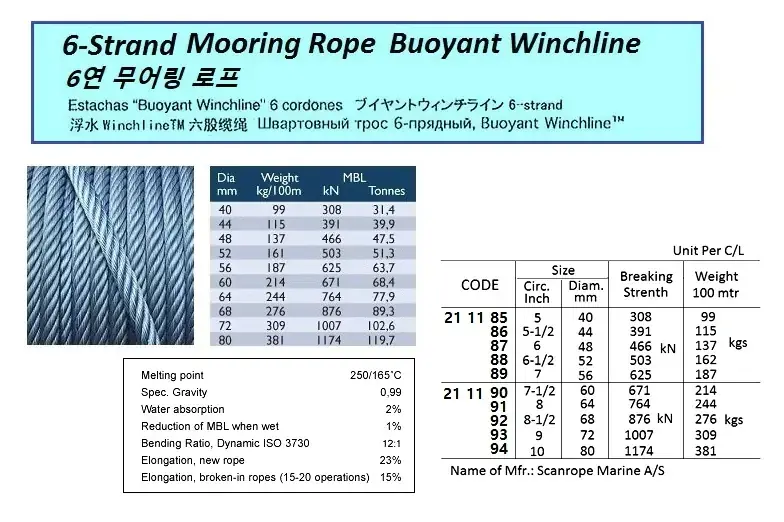 | Description | BOUYANT WINCHLINE 6-STRAND MOORING ROPE, 56 MM , BTL: 625 KN x (LENGTH) |