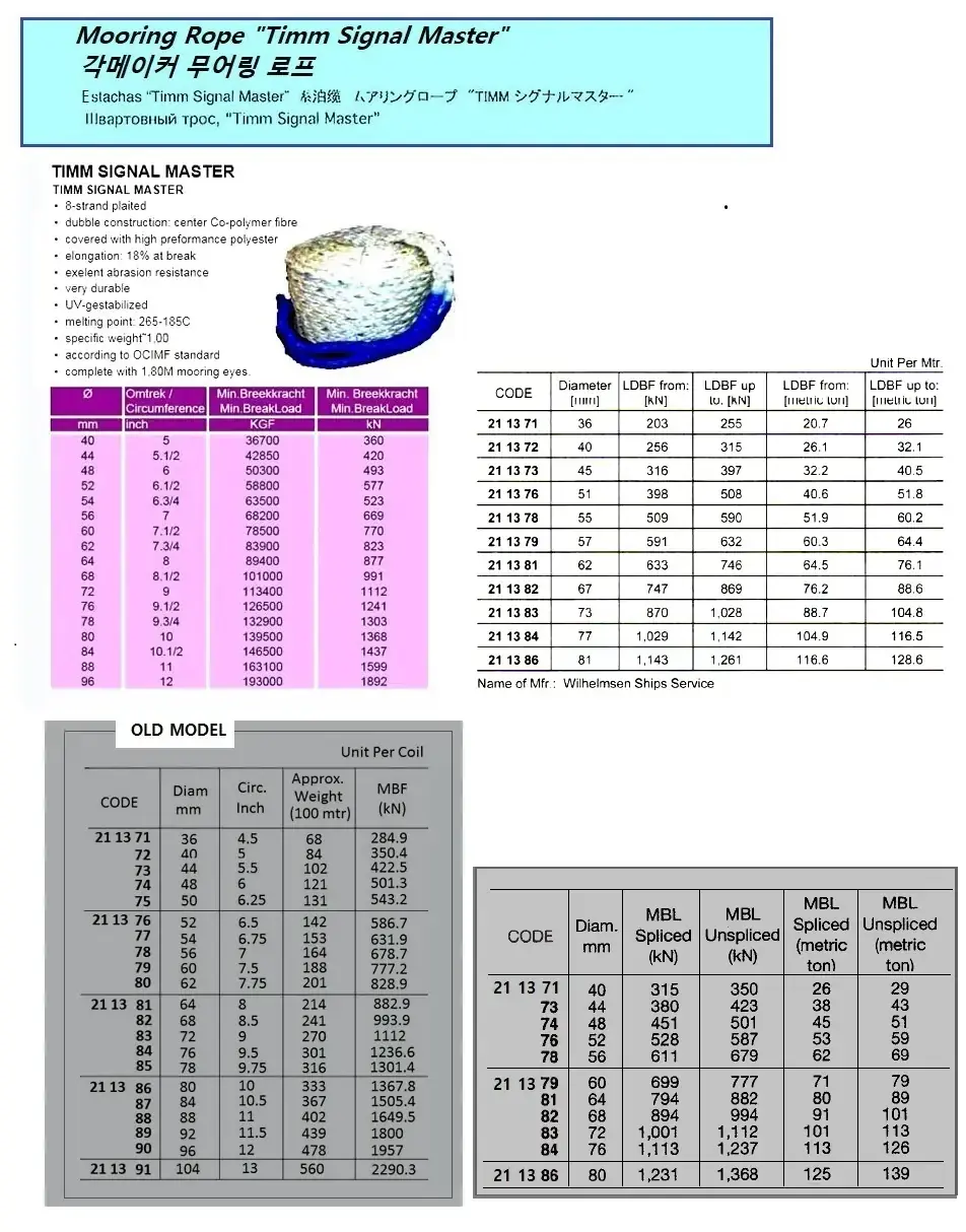 | Description | OLD MODEL : MOORING ROPE, TIMM SIGNAL MASTER 8-STR OR 12-STRAND, 104 MM ,MBF: 2290.3 KN x (LENGTH, EYE SPLICE SIZE) |