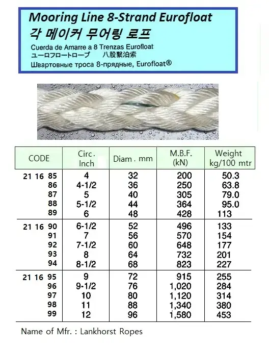 | Description | 8-STRAND, EUROFOLAT MOORING LINE, 48 MM, 200 MTR. MBF 428 KN |