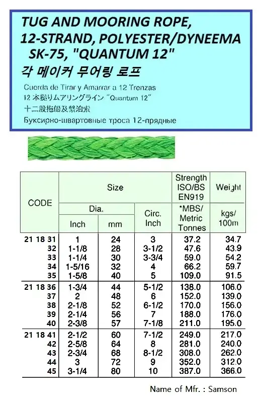| Description | TUG AND MOORING ROPE, 12-STRAND, POLYESTER/DYNEEMA SK-75, QUANTUM 12, 200 MTR x 24 MM, BTL: 37.2 TON |