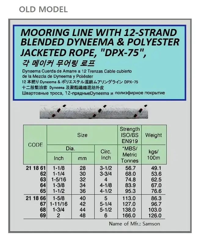 | Description | OLD MODEL : MOORING LINE WITH 12-STRAND, BLENDED DYNEEMA & POLYESTER JACKETED ROPE, "DPX-75", 200 MTR x 40 MM, BTL: 113 TON |