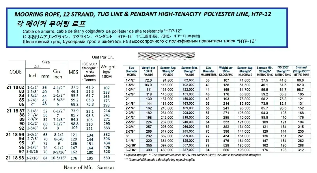 | Description | 12 STRAND, MOORING ROPE, TUG LINE & PENDANT HIGH-TENACITY POLYESTER LINE, HTP-12, 60 MM , MBS: 110 TON |