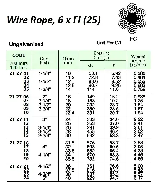 | Description | WIRE ROPE, UN-GALV, 6xFI(25) FC 40 MM DIA x 200 M |