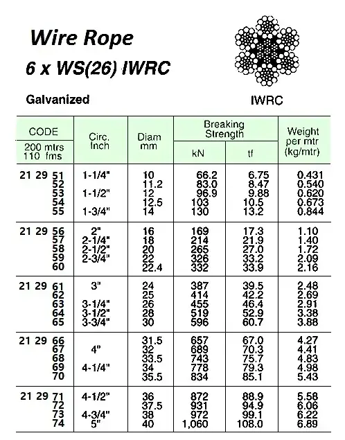 | Description | WIRE ROPE, GALV. 6xWS(26) IWRC 16 MM DIA x 200 M |