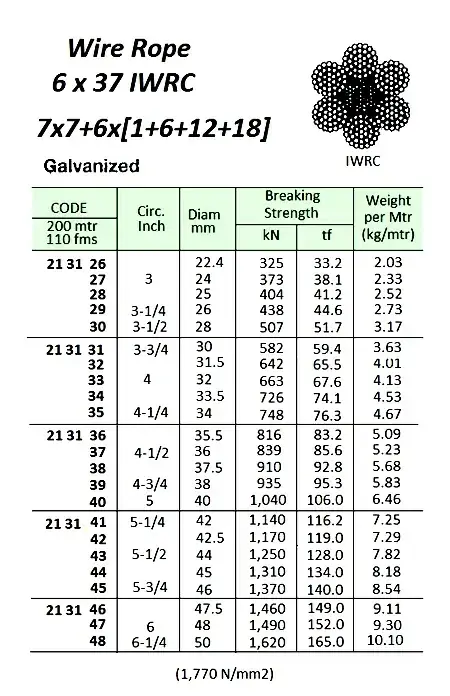 | Description | WIRE ROPE, GALV. 6x37 IWRC 48 MM DIA x 200 M/CL |