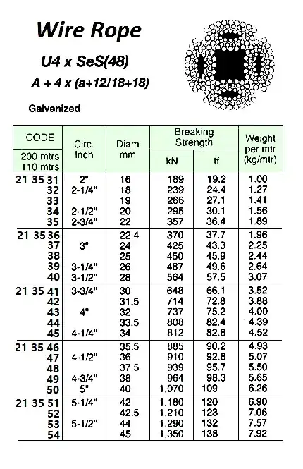 | Description | WIRE ROPE, NON-ROTATING, U4xSeS(48) FC, GALV. 200 MTR x 33.5 MM, BTL:808 KN |