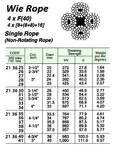 | Description | WIRE ROPE, NON-ROTATING SINGLE ROPE 4xF(40) FC GALV. 38 MM x 200 M |