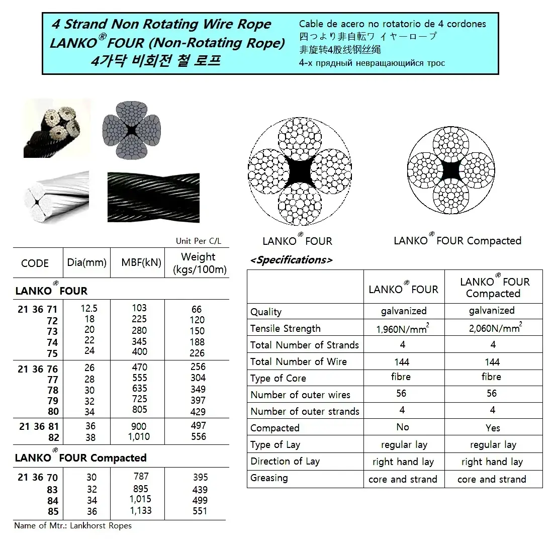 | Description | WIRE ROPE, NON-ROTATING, LANKO FOUR, 4x144, FC, GALV. 24 MM, LANKHORST |
