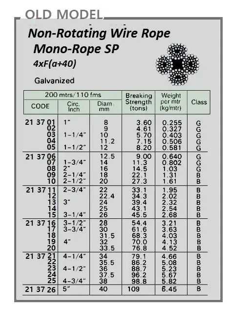 | Description | OLD MODEL, WIRE ROPE, NON-ROTATING MONOROPE SP 4xF (A+40) GALV 22.4 MM x 200 M |
