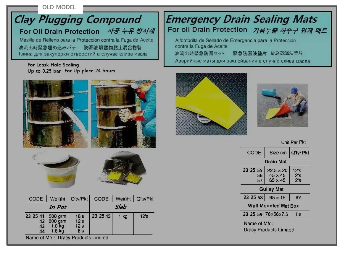 | Description | Old Model, EMERGENCY DRAIN SEALING MAT FOR OIL DRAIN PROTECTION, DRACY PRODUCTS LIMITED, 65 x 65 CM, 2'S/PKT |