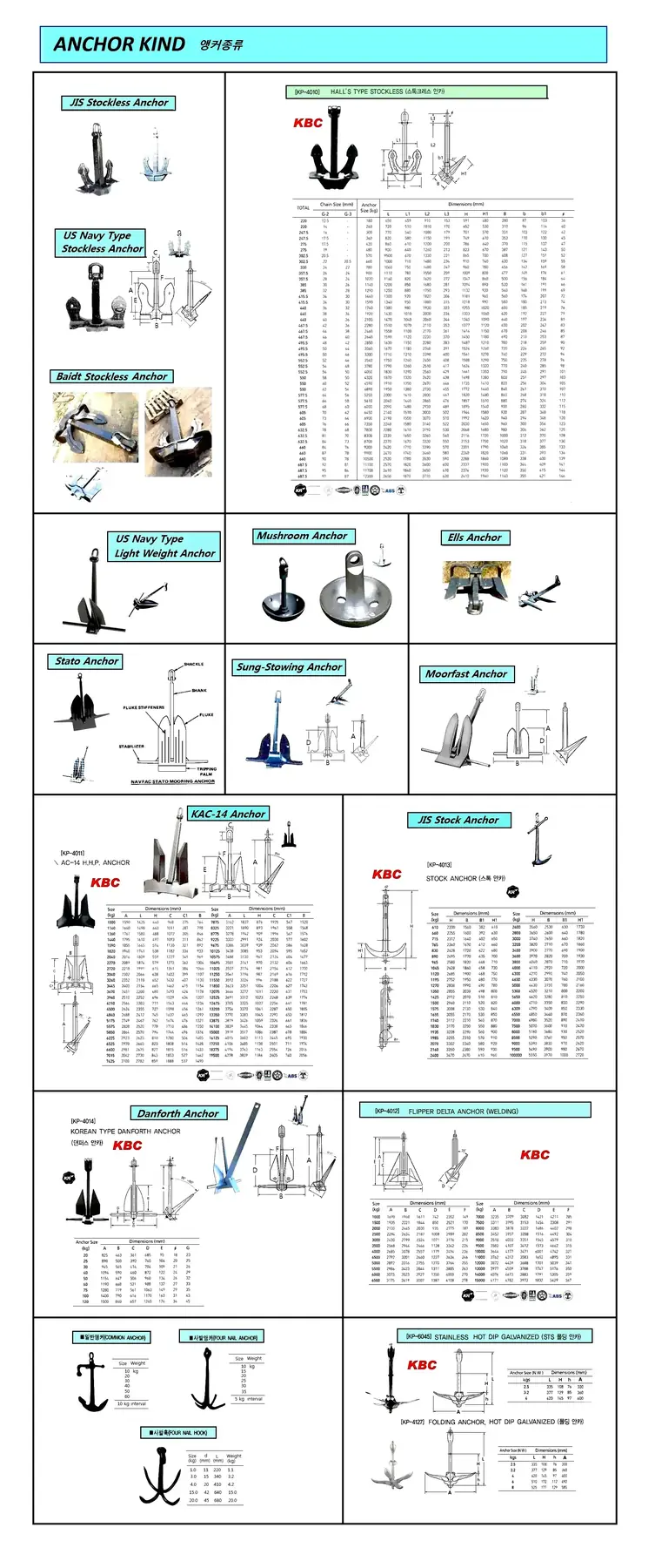 WORLD VARIOUS TYPE ANCHOR ( JIS, US NAVY STOCKLESS ANCHOR, BAIDT STOCKLESS ANCHOR, US NAVY TYPE LIGHT WEIGHT ANCHOR, MUSHROOM ANCHOR, ELLS ANCHOR, STATO ANCHOR, SUNG-STOWING ANCHOR, MOORFAST ANCHOR, KAC-14 ANCHOR, JIS STOCK ANCHOR, DANFORTH ANCHOR, FLIPPE