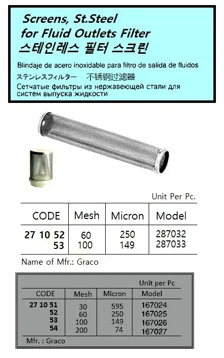| Description | Old Model : SCREEN, STAINLESS STEEL FOR FLUID OUTLET FILTER, 30 MESH x 595 MICRON, 167024, GRACO |