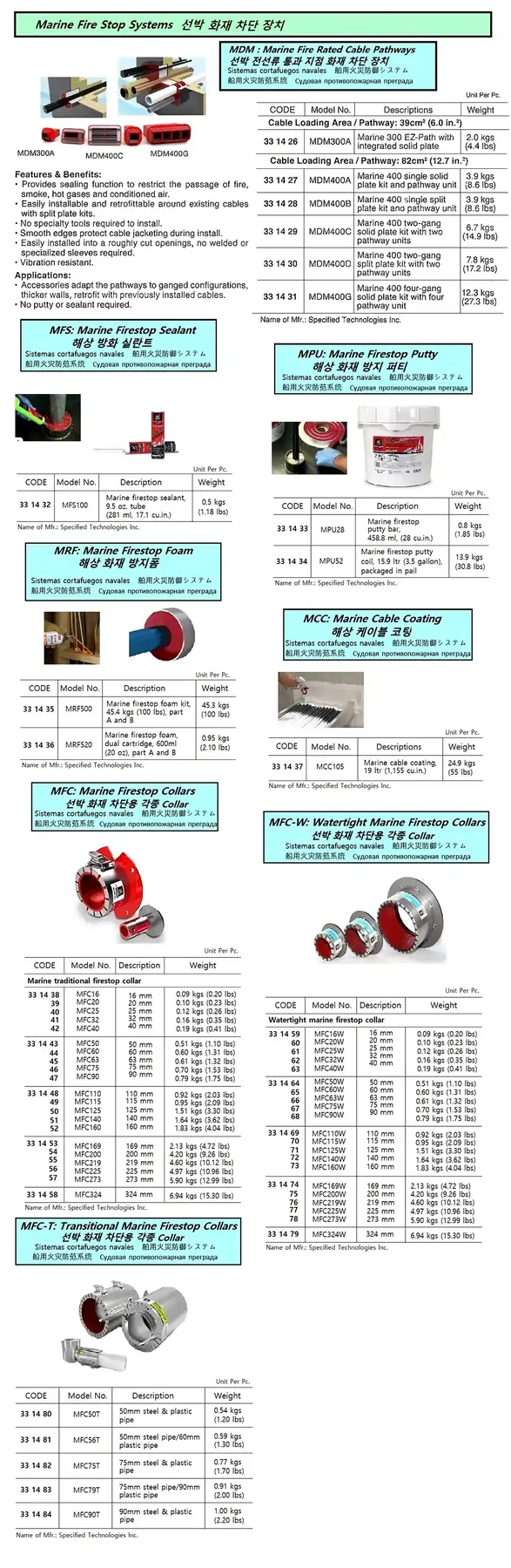 | Description | MARINE FIRE STOP SYSTEM, MFC-W: WATERTIGHT MARINE FIRESTOP COLLARS, MFC110W, SPECIFIED TECHNOLOGIES INC. |