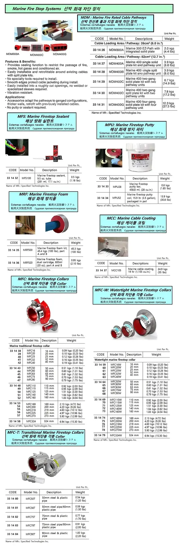 | Description | MARINE FIRE STOP SYSTEM, MFC-W: WATERTIGHT MARINE FIRESTOP COLLARS, MFC225W, SPECIFIED TECHNOLOGIES INC. |