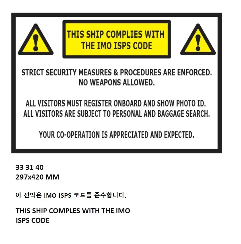 | Description | ISPS CODE SIGN & SECURITY SIGN, 297 x 420 mm, THIS SHIP COMPLES WITH THE IMO ISPS CODE |