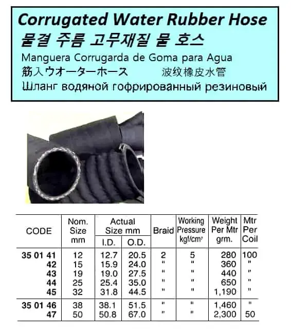 | Description | CORRUGATED WATER RUBBER HOSE, 5KG 32 MM x 2B |