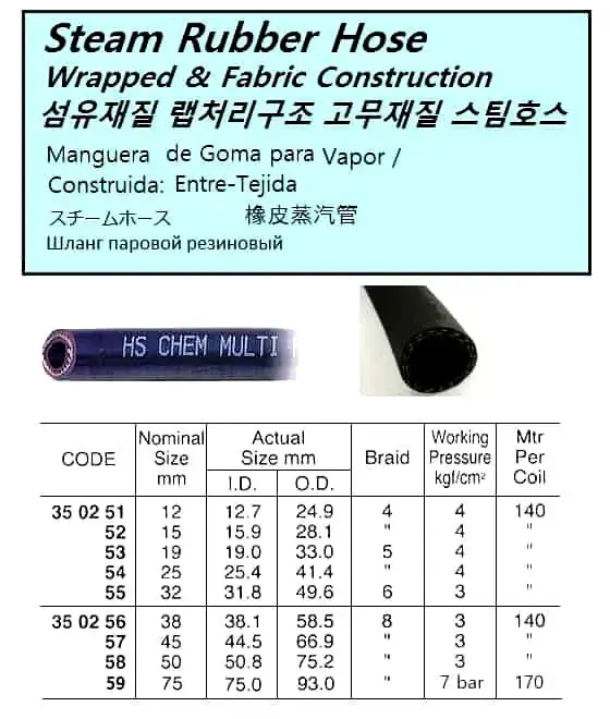 | Description | WRAPPED FABRIC CONSTRUCTION STEAM RUBBER HOSE, 3 KG 38 MM |