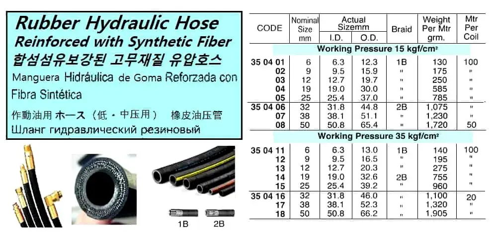 | Description | REINFORCED WITH SYNTHETIC FIBRER RUBBER HYDRAULIC HOSE, 15 KG 6 MM |