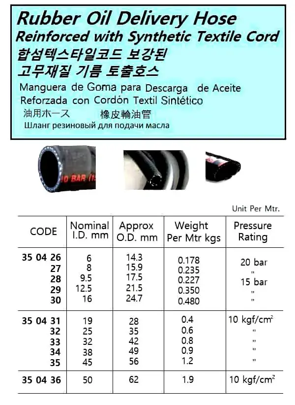 | Description | REINFORCED WITH SYNTHETIC TEXTILE CORD RUBBER OIL DELIVERY HOSE, 15 BAR 9.5 MM |