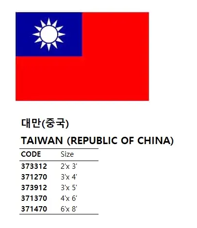 | Description | NATIONAL FLAG, SIZE:2'x 3', TAIWAN (REPUBLIC OF CHINA) |