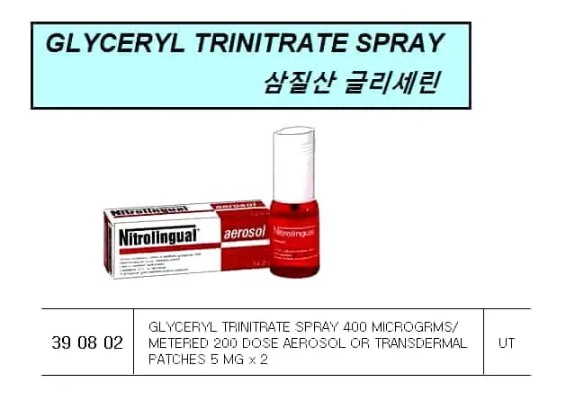 | Description | GLYCERYL TRINITRATE SPRAY 400 MICROGRMS/ METERED 200 DOSE AEROSOL OR TRANSDERMAL PATCHES 5 MG x 2 |