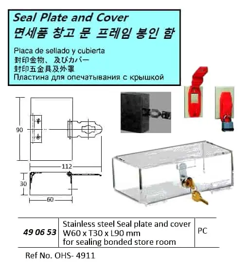 | Description | SEAL PLATE AND COVER FOR BONDED STORATE ROOM, 50x30x90MM, ST.STEEL, OHS-4911 |