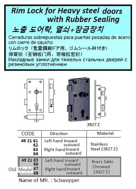 | Description | RIM LOCK FOR HEAVY STEEL DOOR WITH RUBBER SEALING, ST.STEEL, RIGHT HAND OUTWARD, 3827 Z |