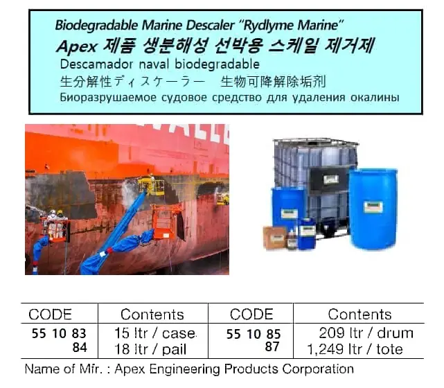 | Description | APEX, BIODEGRADABLE MARINE DESCALER "RYDLYME MARNE" 18 LTR/PAIL |