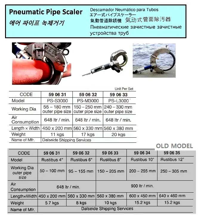 | Description | PNEUMATIC PIPE SCALER, RUSTIBUS PS-L3000, 240-330 MM OD PIPE |