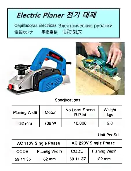 | Description | ELECTRIC HAND PLANER, W82 MM AC110V 1-PHASE |