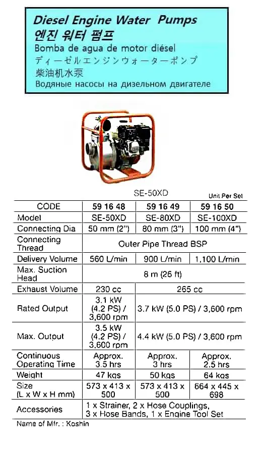| Description | DIESEL ENGINE WATER PUMP, 80MM (3") 8 MTR 900 L/MIN, SE-80XD, KOSHIN |