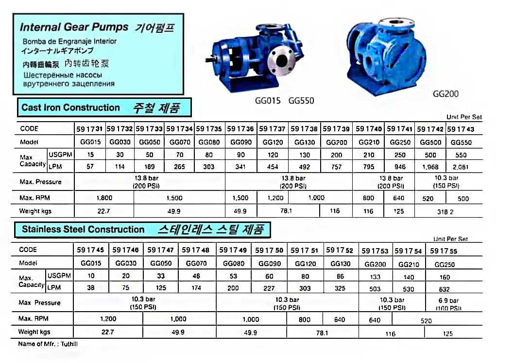 | Description | CAST IRON INTERNAL GEAR PUMP, GG250, TUTHILL |