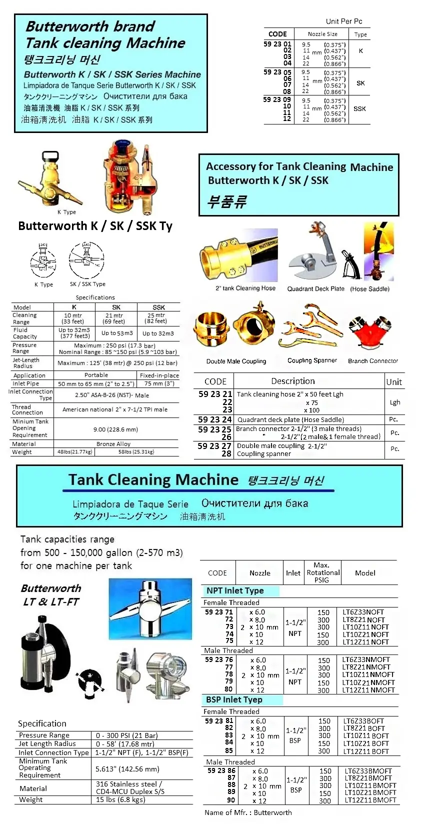 | Description | TANK CLEANING MACHINE, 1-1/2" BSP INLET TY, FEMALE THREAD, 2 x 10 MM, LT10Z21BOFT, BUTTERWORTH |