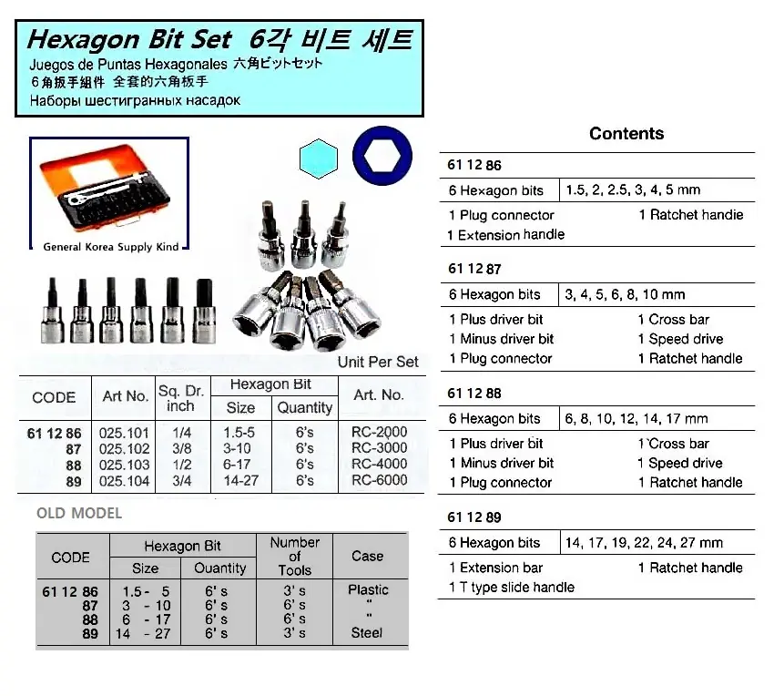 | Description | HEXAGON BIT SET, 6-17 MM 6 BITS & 6 TOOLS |