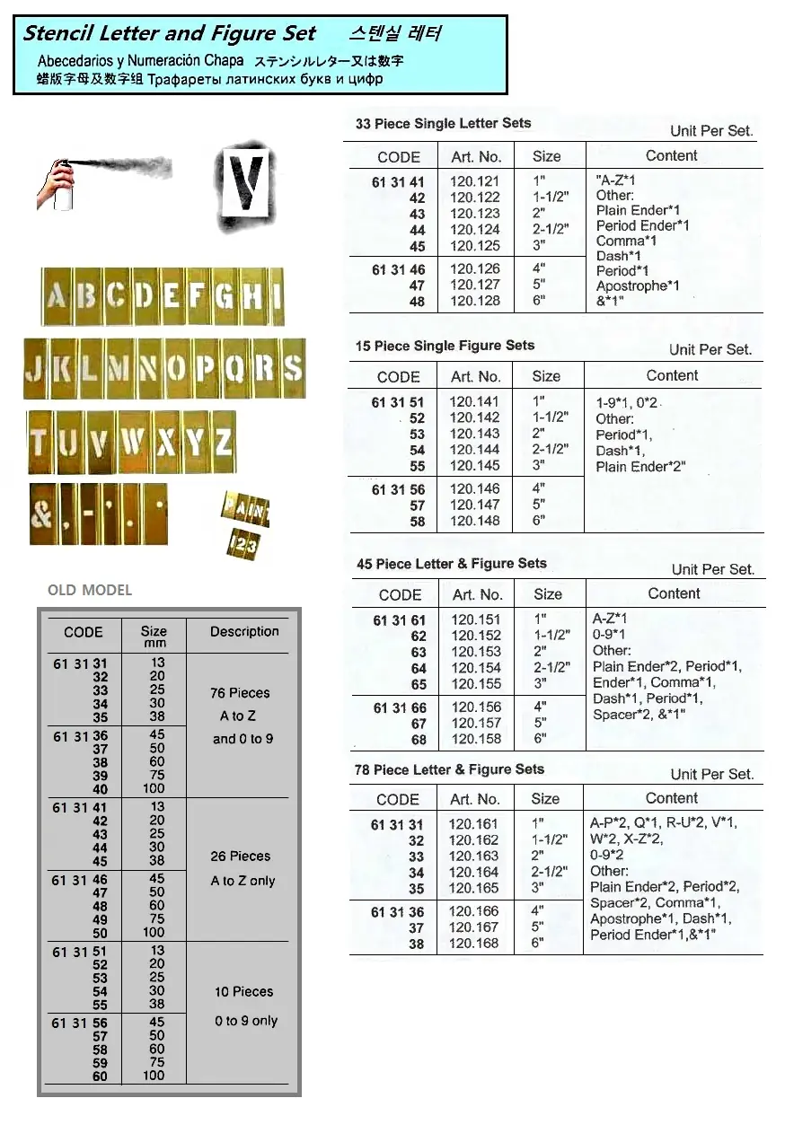 | Description | STENCIL LETTER SET, BRASS, A-Z, 0-9 & 45'S/SET, 1-1/2" (38 MM) |