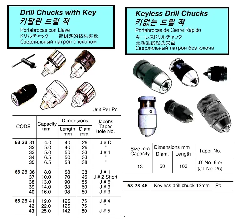| Description | DRILL CHUCK, WITH KEY 19.0 MM DIAM 75 MM J.T. HOLE #4 |