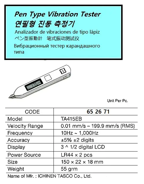 | Description | PEN TYPE VIBRATION TESTER, 0.01~199.9 MM/S (RMS), TA415EB, ICHINEN TASCO CO.,LTD |