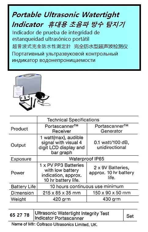 | Description | PORTABLE ULTRASONIC WATERTIGHT INTEGRITY TEST INDICATOR PORTASCANNER, COLTRACO ULTRASONIC LTD UK |