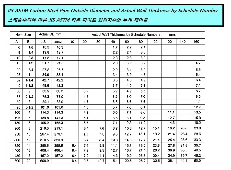JIS ASTM CARBON STEEL PIPE OUTSIDE DIAMETER COMPARISON AND ACTUAL WALL THICKNESS BY SCHEDULE NUMBER