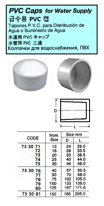 | Description | PVC CAPS FOR WATER SUPPLY, SIZE 16 |