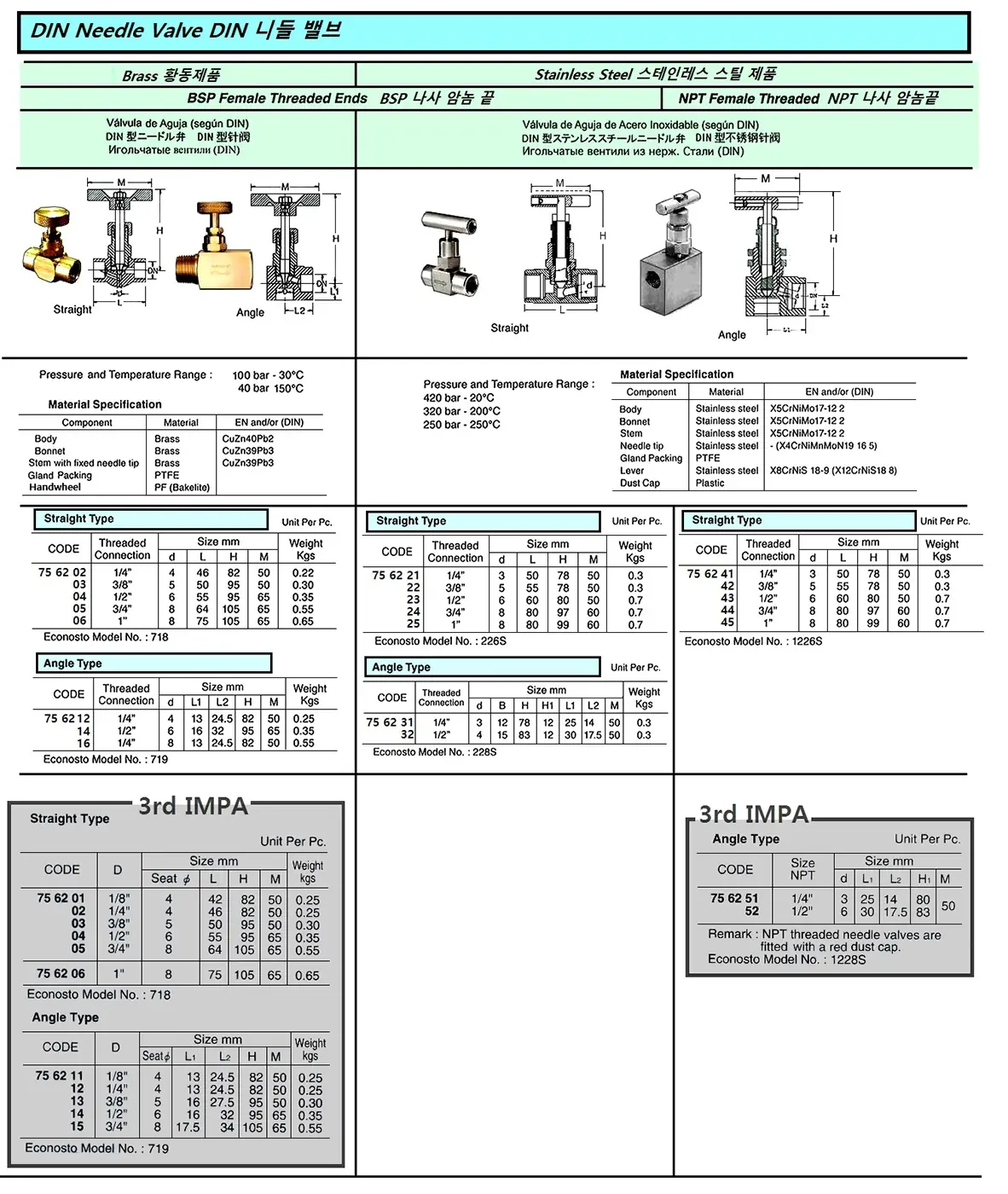 | Description | NEEDLE VALVE (DIN), BRASS, BSP FEMALE SCREW END, STRAIGHT, ECONOSTO 718, 3/4" |