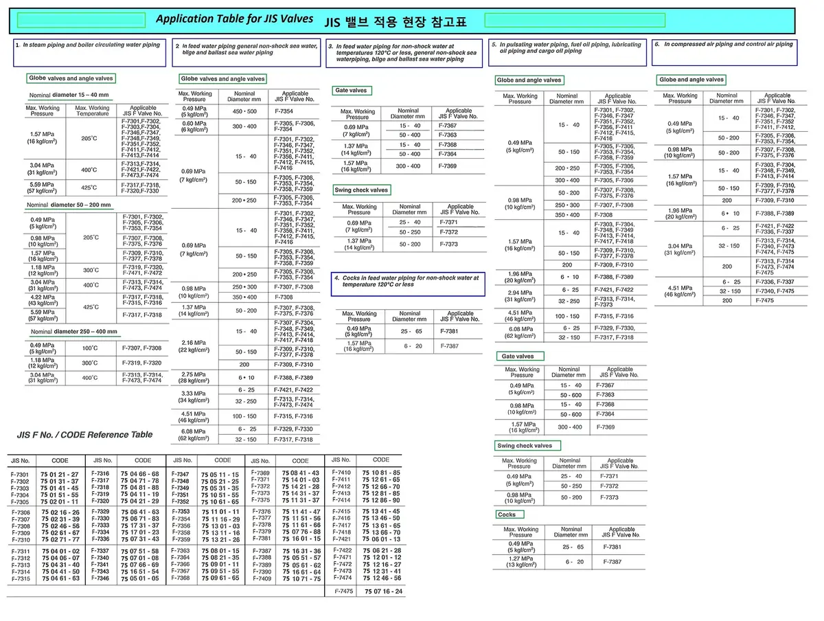 | Description | APPLICATION TABLE FOR JIS VALVE |